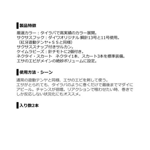 ダイワオリジナル 鯛針13号と11号使用(紅牙遊動テンヤ+SSと同様)