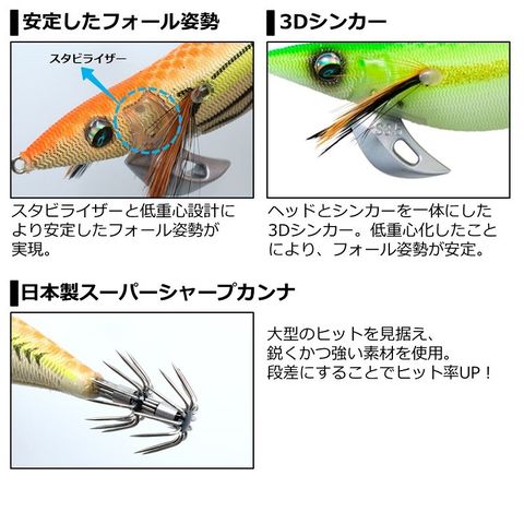 スタビライザーと低重心設計により揺ぎない安定感を実現。飛距離、フォールの安定感、強波動で今まで反応しなかったイカを狙い打つ。