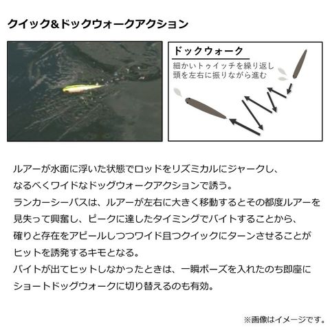 ルアーが水面に浮いた状態でロッドをリズミカルにジャークし、なるべくワイドなドッグウォークアクションで誘う。