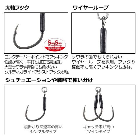 サワラ・タイ・青物等の混合狙いで威力を発揮、リア専用のアシストフック