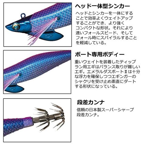 重いウェイトを装着したティップラン用エギはバランス取りが難しいエギです。エメラルダスボート2は十分な浮力を確保しつつエギンガーのシャクリを受け止め素直にダートする形状になっています。