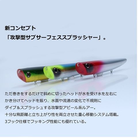 ただ巻きをするだけで斜めに切ったヘッドが水を受け水を左右にかき分けてヘッドを振り、水面や流速の変化で不規則にダイブ&スプラッシュする攻撃型アピール系ルアー。