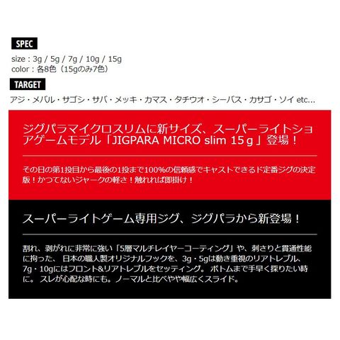 ◆ジグパラマイクロスリムに新サイズ、スーパーライトショアゲームモデル「JIGPARA MICRO slim 15g」登場!