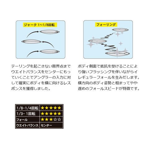 フォール時は横姿勢となることで、やや遅めのスピードとなり、じっくりとターゲットにアピールします。