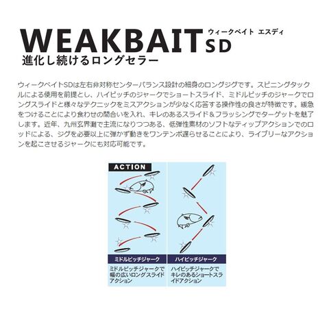 ウィークベイトSDは左右非対称センターバランス設計の細身のロングジグです。