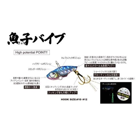 アジ・メバルをメインとし、何でも釣れるのが特徴のマイクロメタルゲーム。しかし、軽量ウエイトの為、使用感が薄いという点が従来の課題であった。これをクリアーすべく誕生したのが「魚子バイブ」である。圧倒的な使用感と強波動による集魚効果は絶大!!究極のライトアイテムだといえる。