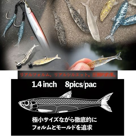 1.5inch極小サイズで、そのままの小魚のフォルム・シルエットをヒレの先まで極めてリアルにソフトルアーで再現しました。