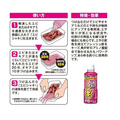 漬け込むだけで有頭エビやオキアミのエサ持ちがアップする調整材。