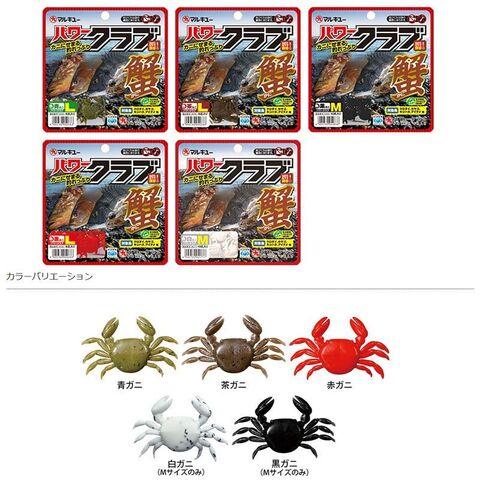 「パワーイソメ」に用いられている素材を使用し、カニを模したフォルムに仕上げました。カニをエサにして釣ることが多いクロダイ・チヌ、カサゴ、キジハタ、アイナメなどに特に効果的。穴釣り、ブッ込み、落とし込み(ヘチ釣り)など様々な釣りに対応し、ブラクリやジグヘッドにつけてもOK。MとLの2つのサイズに青ガニ、茶ガニ、赤ガニ、白ガニ(Mのみ)、黒ガニ(Mのみ)のカラーをラインナップしています
