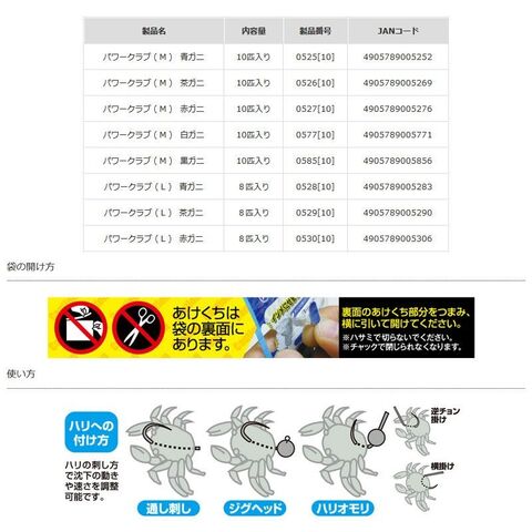 「パワーイソメ」に用いられている素材を使用し、カニを模したフォルムに仕上げました。カニをエサにして釣ることが多いクロダイ・チヌ、カサゴ、キジハタ、アイナメなどに特に効果的。穴釣り、ブッ込み、落とし込み(ヘチ釣り)など様々な釣りに対応し、ブラクリやジグヘッドにつけてもOK。MとLの2つのサイズに青ガニ、茶ガニ、赤ガニ、白ガニ(Mのみ)、黒ガニ(Mのみ)のカラーをラインナップしています