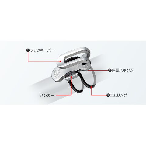 フックキーパー両サイドのハンガーにゴムリングを引っ掛けるだけで簡単に装着。