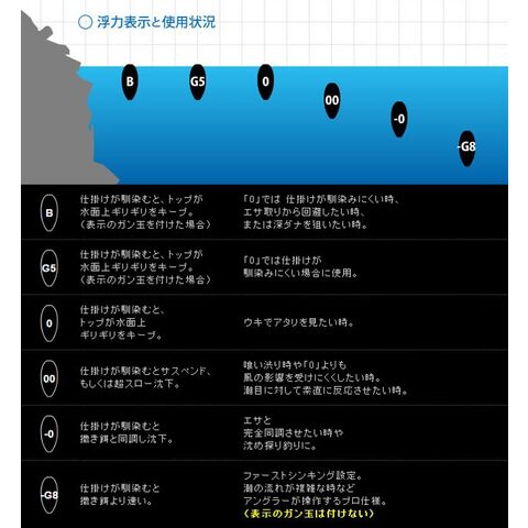 仕掛けが馴染むと、トップが水面上ギリギリをキープ。(表示のガン玉を付けた場合) 「0」では仕掛けが馴染みにくい場合に使用。
