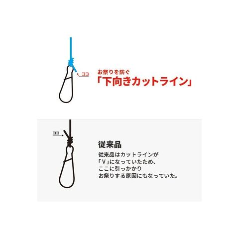 従来品はカットラインが 「V」 になっていたため、ここに引っかかりお祭りする原因にもなっていた。