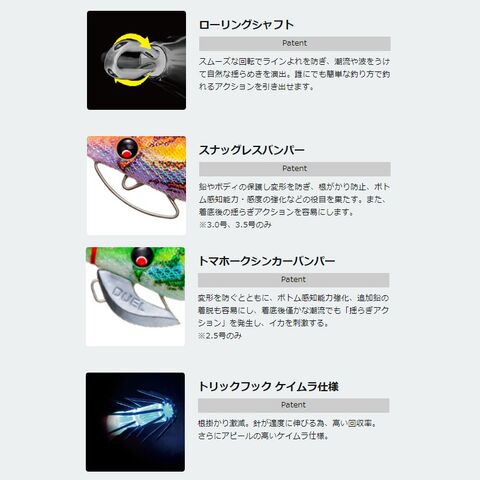 変形を防ぐとともに、ボトム感知能力強化、追加鉛の着脱も容易にし、着底後僅かな潮流でも「揺らぎアクション」を発生し、イカを刺激する。