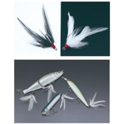 ルアーに追従した際に見せる絶妙なボリュームが生み出す時差アクションはタフコンディションであと一歩出来らないバイトを誘発する。時にルアーを止める為のブレーキとなり、時に魚からフックの存在を隠してくれる。また時には、フックを魚に吸い込ませやすくし、フッキング率をアップさせる。状況に応じて獲る為に必要不可欠なチューンアイテムとしてのフェザーフック。