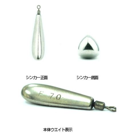ラインはハリス止めを採用し、結びコブを引っ掛けるだけの簡単セットが可能。形状は、底部に重心がある縦長形状。縦長にする事でシンカーの根がかりを回避しつつも、沈下速度を妨げない。また、本体断面は三角形となっている。ボトムで横倒しになった際、不用意に転がりにくい形状だ。