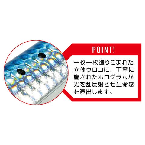 イワシを再現したリアルボディーに一枚ずつ立体設計されたウロコがメラメラと艶かしい乱反射を発生させます。