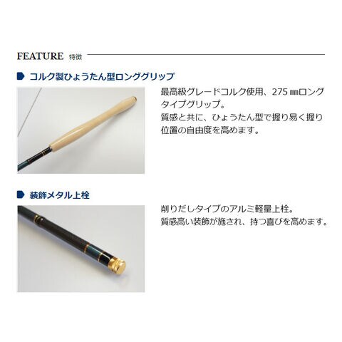 グリップ部は最高級グレードコルクを使用し、275mmのロングタイプで、握り易さを産むひょうたん型に設計。