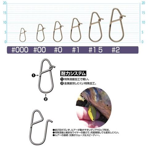 ?特殊溶接加工で軽い。?金属疲労しにくい特殊加工。 ・結び目がズレず、ルアーが動きやすいティアドロップ形状。 ・特殊溶接と絶妙なワイヤーの硬さで、何度開閉しても変形しにくい。 ・ルアーの接続・交換がスムーズ&スピーディー。
