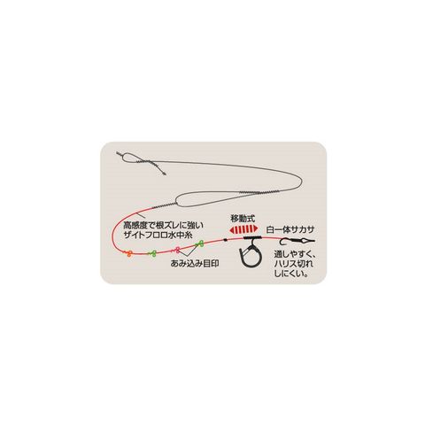 高感度で根ズレに強いザイトフロロ水中糸、あみ込み目印、チタンチューブ鼻かん、白一体サカサ使用。