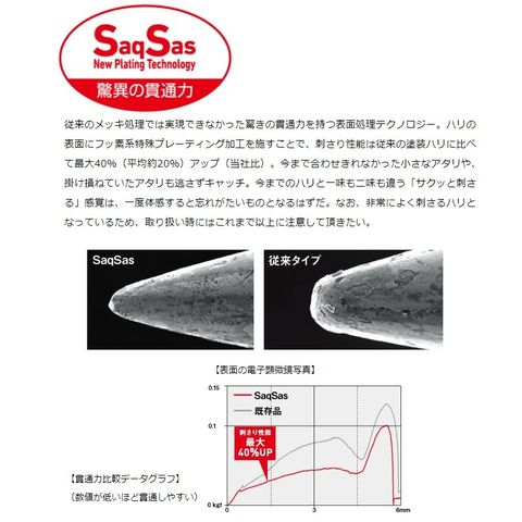 ハリの表面にフッ素系特殊プレーティング加工を施すことで、刺さり性能は従来の塗装ハリに比べて最大40%(平均約20%)アップ(当社比)。