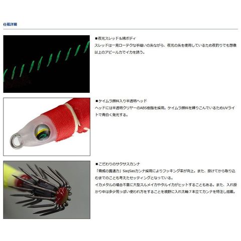 スレッドは一見ローテクな手縫いの糸ながら、夜光の糸を使用しているため夜釣りでも想像以上のアピール力でイカを誘う。