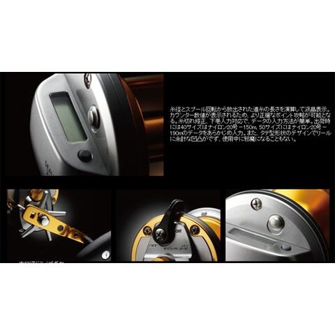 糸径とスプール回転から放出された道糸の長さを演算して液晶表示。カウンター数値が表示されるため、より正確なポイント攻略が可能となる。糸切れ修正、下巻入力対応で、データの入力方法が簡単。出荷時には40サイズはナイロン20号-150m、50サイズにはナイロン20号-190mのデータをあらかじめ入力。また、タテ型形状のデザインでリールに余計な凹凸がでず、使用中に邪魔になることもない。