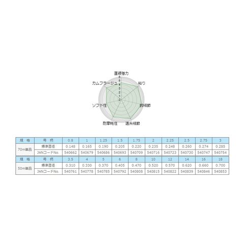 ・屈折率:1.42 (水の屈折率(1.33)と近いため水中でラインが見えにくい。)