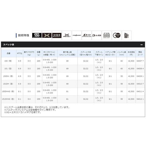 ※1:スプール糸巻き部の溝は、それぞれ1/3、2/3を表しています。
