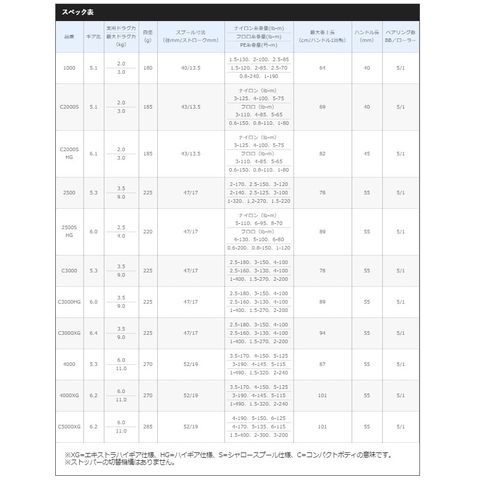 ※XG=エキストラハイギア仕様、HG=ハイギア仕様、S=シャロースプール仕様、C=コンパクトボディの意味です。