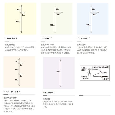 シリーズ最長寸法で、大きな動きでパラソルを誘う超ロングエダスタイプ。潮が速い時もスッテが安定。