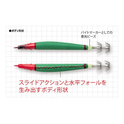 水平姿勢のスローフォールでじっくりイカにアピールするバランスに設計。