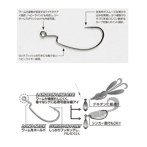 シャンクが常に下側に安定しやすく、水中でのワームの上下を確実にアングラーの意図通り向かわせるタテアイフックの特長と、ワイドアイの長所を融合。シンカーフリーとなるテキダンやテキサスリグにもその性能を発揮。