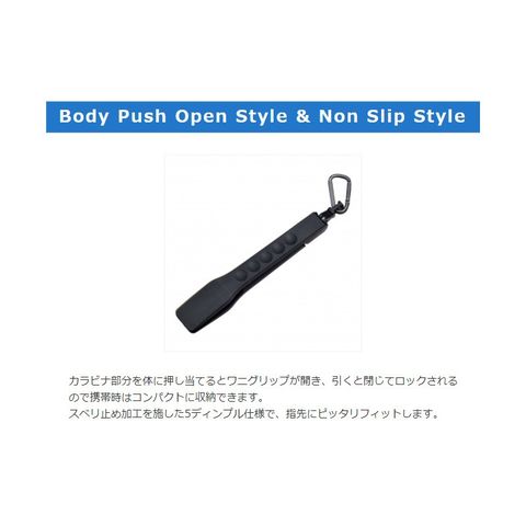 カラビナ部分を体に押し当てるとワニグリップが開き、引くと閉じてロックされるので携帯時はコンパクトに収納できます。