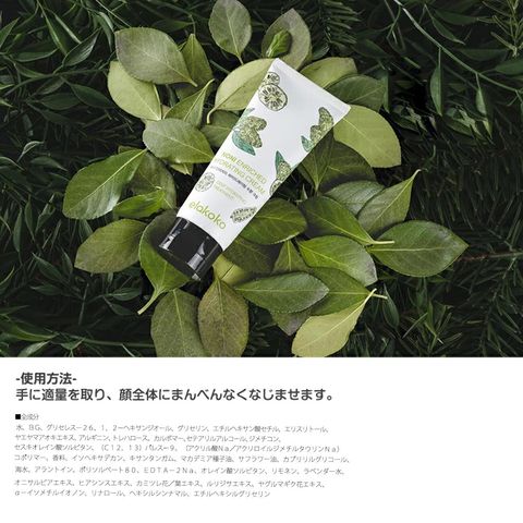 水、BG、グリセレス-26、1,2-ヘキサンジオール、グリセリン、エチルヘキサン酸セチル、エリスリトール、ヤエヤマアオキエキス、アルギニン、トレハロース、カルボマー、セテアリルアルコール、ジメチコン、セスキオレイン酸ソルビタン、(C12,13)パレス-9、 (アクリル酸Na/アクリロイルジメチルタウリンNa)コポリマー、香料、イソヘキサデカン、キサンタンガム、マカデミア種子油、サフラワー油、カプリリルグリコール、海水、アラントイン、ポリソルベート80、EDTA-2Na、オレイン酸ソルビタン、リモネン、ラベンダー水、オニサルビアエキス、ヒアシンスエキス、カミツレ花/葉エキス、ルリジサエキス、ヤグルマギク花エキス、α-イソメチルイオノン、リナロール、ヘキシルシンナマル、エチルヘキシルグリセリン