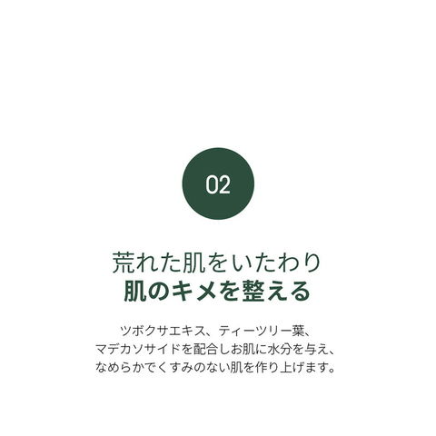 ■ツボクサエキス、ティーツリー葉、マデカソサイドを配合しお肌に水分を与え、滑らかでくすみのない肌を作り上げます。