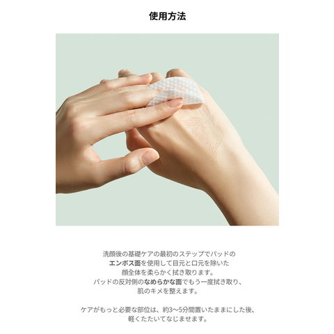 ■洗顔後の基礎ケアの最初のステップで、パッドのエンボス面を使用して目元と口元を除いた顔全体をやわらかく拭き取ります。