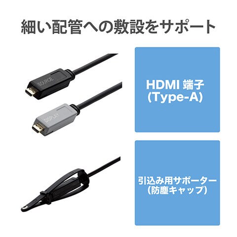 ■細い配管への敷設を便利に行える脱着可能なHDMI(Type-A)端子と引込み用サポーター、および防塵キャップ、約3.6mm径のケーブルを採用しています。
