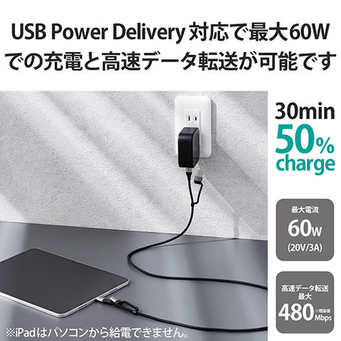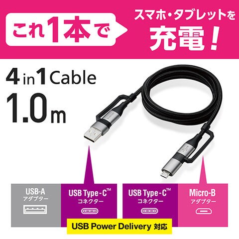 エレコム(ELECOM) MPA-AMBCC10BK ブラック 4in1 充電/データ通信ケーブル PD対応 60W 20V/3A /1m