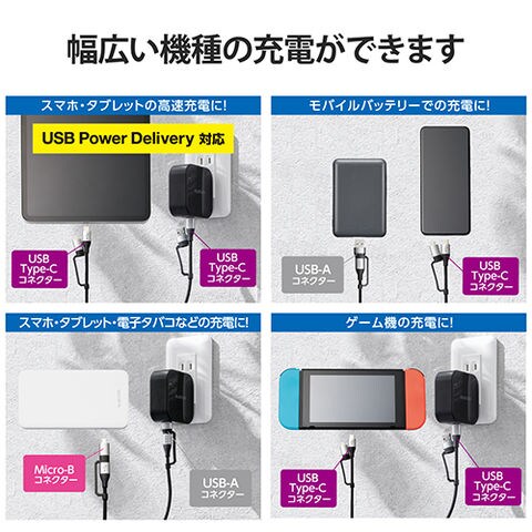 対応機種:USB-A側:USB-A端子搭載のパソコン、AC充電器など、USB Micro-B側:USB Micro-B端子搭載のモバイルバッテリー、電子タバコなど、USB Type-C(TM)側:USB Type-C(TM)端子搭載のAC充電器、スマートフォン、タブレットなど
