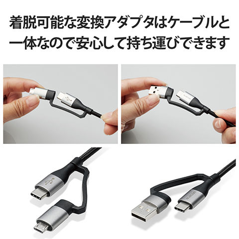■機器に合わせてコネクターを付け替えられる4in1 USBケーブルです。データ転送や充電のために機器のコネクターに合わせて複数のケーブルを用意する煩わしさを解消できます