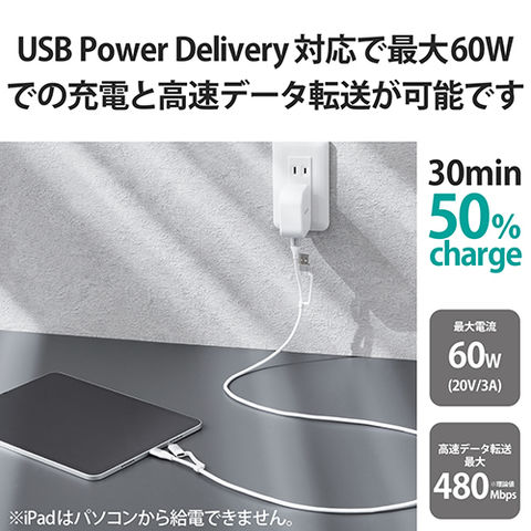 ■USB PD(USB Power Delivery)に対応し、最大60W(20V/3A)の大電流を送電可能です