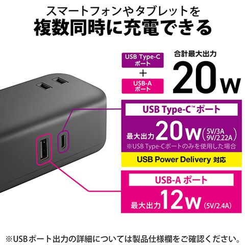 ■USBの最大出力は20Wで、別途充電器などを用意することなく、対応するスマートフォンやタブレットを2台同時に充電できます
