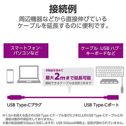 ■ケーブル一体型のAC充電器のケーブル長を延長して使用できるほか、USBハブやドッキングステーション、キーボードなどケーブル部が短い機器にも使えるため、パソコンから離れた位置での接続も可能になります。