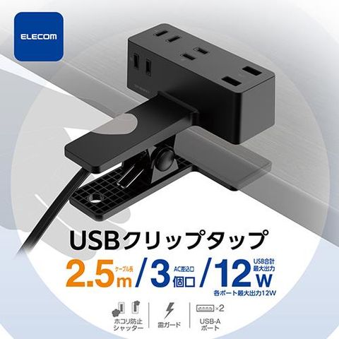 ■机などに挟んで使えるクリップ機構を搭載した、USB-Aポート付きの電源タップです。