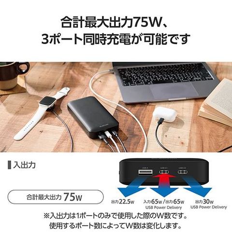 ■USB Power Delivery 65W出力に対応し、パソコン、スマートフォン、タブレットを高速充電できる、20000mAhモバイルバッテリーです。