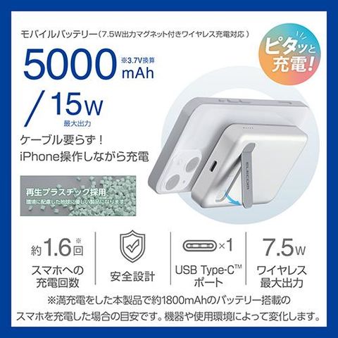 エレコム(ELECOM) DE-C53-5000WH ホワイト ワイヤレスモバイルバッテリー 5000mAh スタンド付き