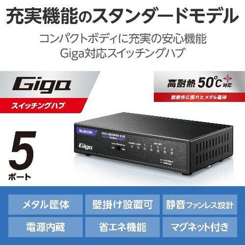 エレコム(ELECOM) EHC-G05MN4-HJB ブラック スイッチングハブ LANハブ 5ポート Giga対応 1000/100/10Mbps メタル筐体 マグネット 電源内蔵 ファンレス