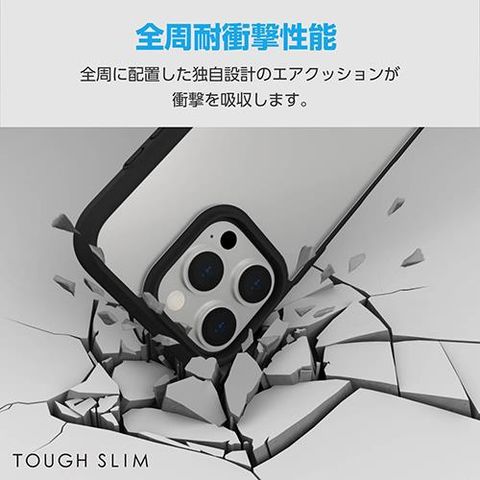 ■衝撃を吸収するエアークッションを全周に配置し、背面には傷に強く割れにくいポリカーボネート素材を採用しました。付属の画面保護のガラスフィルムとケースで、端末を360度全面保護するTOUGH SLIMケースです。