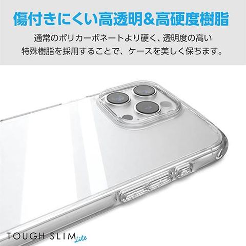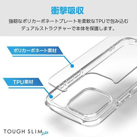 ■全周に配置した独自設計のエアークッションが衝撃を吸収し、側面に弾力性のあるTPU(熱可塑性ポリウレタン)素材を、背面に高硬度のポリカーボネート素材を使用した、機器本体デザインを損ねないオールクリアタイプのTOUGH SLIM LITEケースです。